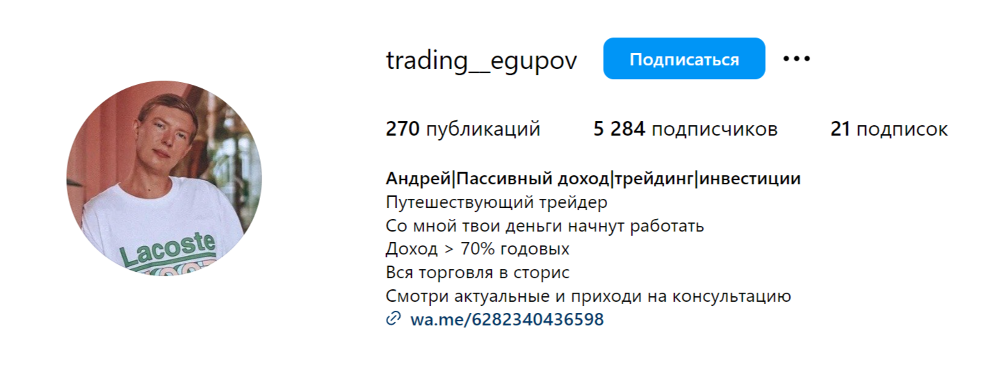 Дополнительных сведений касательно деятельности героя материала в качестве трейдера найти не удалось. При этом в сети встречается неприятная история, в которой засветился не только Егупов, но и Андрей Safonov. Эта парочка зимой 2023-го разместила публикацию о возможности быстрого получения пассивного заработка.