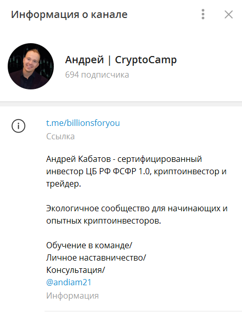 Андрей CryptoCamp активно продвигает свой веб-ресурс в информационном пространстве. Блогер имеет аккаунт в Телеграмм @ billionsforyou, где число подписчиков чуть превышает 600 чел. Канал живой, контент регулярно обновляется, но интереса не вызывает.