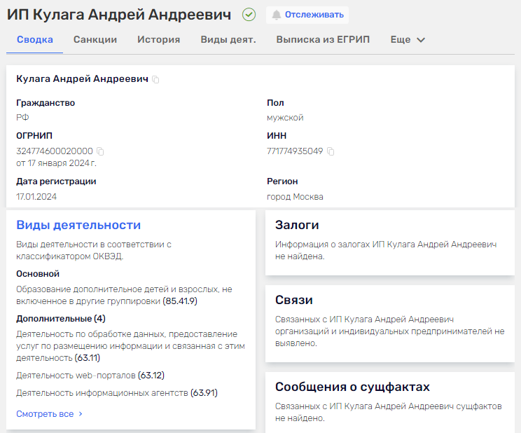 В реестре юридических компании мы нашли ИП. Зарегистрировался он в январе 2024 года, хотя судя по его телеграм-каналу, академией Finup Academy он управляет около 6 лет. Видимо, несколько лет он работал нелегально.