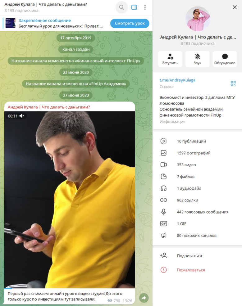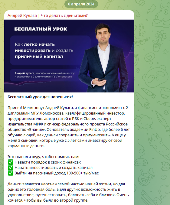 В телеграм-канале нет приветственного сообщения, поэтому не особо понятно, кто такой Андрей Кулага, какой у него опыт работы с финансами, какие достижения и так далее. В описании группы коротко указывается, что автор является инвестором и экономистом с двумя дипломами МГУ. Подтверждений этому нет.