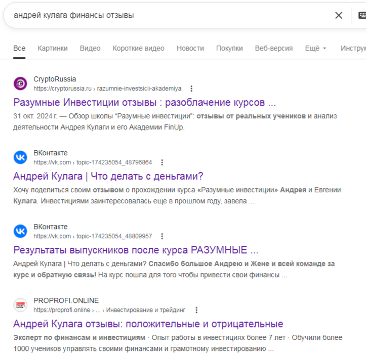 Исходя из всего нами увиденного, деятельность Andrey Kulaga напоминает инфоцыганство. Если бы он реально был экспертом с большим стажем работы и помогал людям обучаться финансовой грамотности, он бы обладал успешной репутацией и был известным.