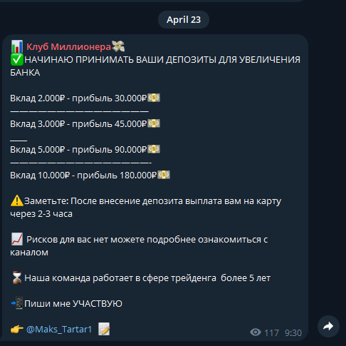 Публикации в Telegram-канале Максима Тартарова содержат предложения внести депозиты от 2000 до 10000 рублей. Заявленная прибыль варьируется от 30000 до 180000 рублей. Выплаты обещают в течение 2–3 часов на карту. Подробностей о механизме работы нет.