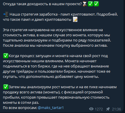 В канале Максима Тартарова описана стратегия пампа. Согласно публикациям, команда подбирает монеты, после чего организует их массовую скупку. Это должно вызывать рост цены, после чего актив продаётся. «Клуб Миллионера» утверждает, что такие действия приносят прибыль в несколько раз выше вложений. В качестве контактного лица указан @maks_tartar1.