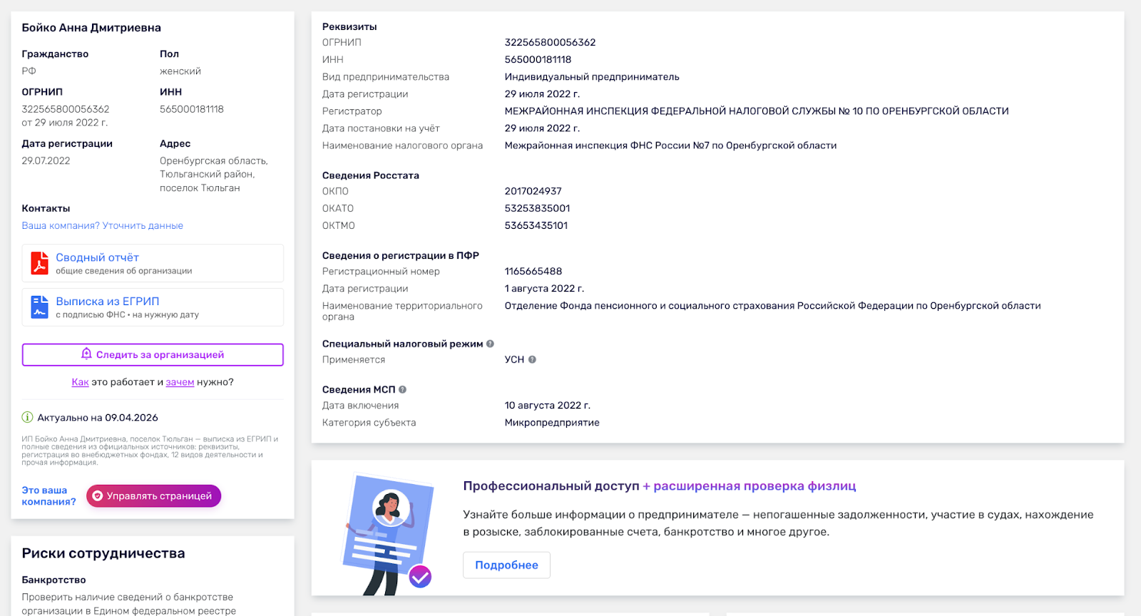 Мошенником SMM Анну Бойко назвать точно нельзя, так как она ведет свою деятельность полностью законно. Школа работает от имени ИП Бойко Анна Дмитриевна с ИНН 565000181118 и ОГРНИП 322565800056362. Место регистрации — пос. Тюльган Оренбургской области. Это, кстати, доказывает часть ее биографии, которая касается рождения в маленьком селе.