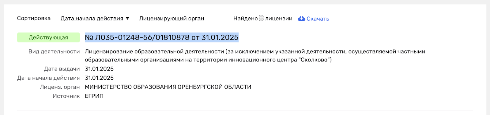 - У коуча есть действующая лицензия №Л035-01248-56/01810878 от 31.01.2025 на предоставление образовательных услуг, выданная Минобром Оренбургской области.