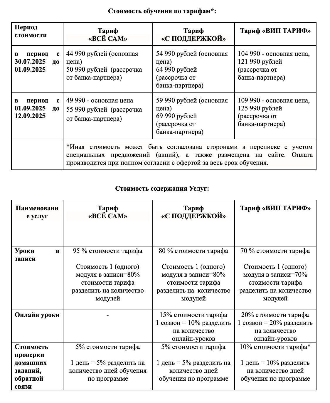 Обучение предлагают в рамках трех тарифных пакетов, которые подробно описаны в договоре-оферте: