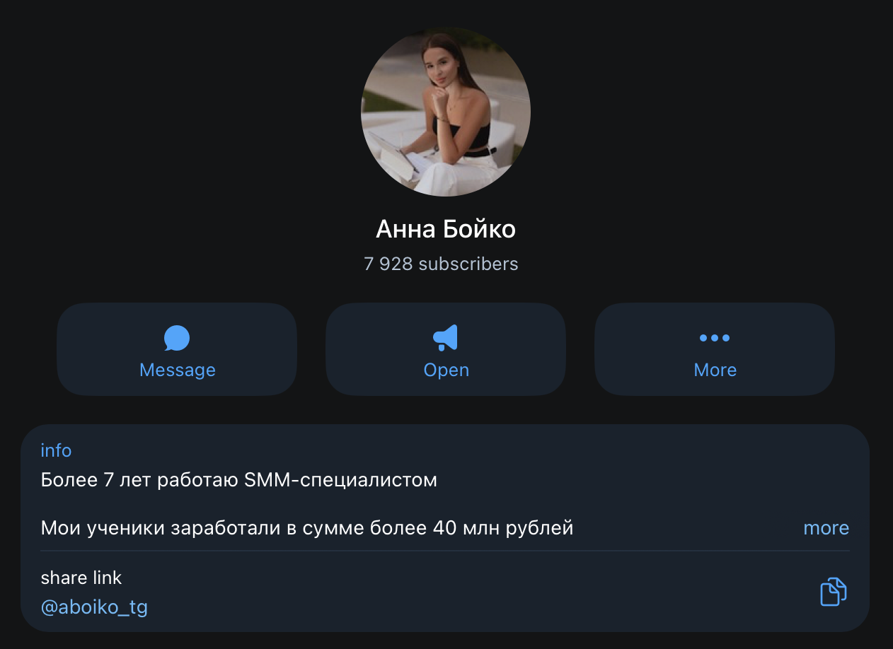 Если с Инстаграм у коуча дела обстоят неплохо, телеграмм-канал Анны Бойко выглядит печальнее. Он находится по адресу @ Aboiko_tg и собрал чуть менее 8 тыс. фолловеров. При этом посты просматривают около 1–2 тыс. человек.