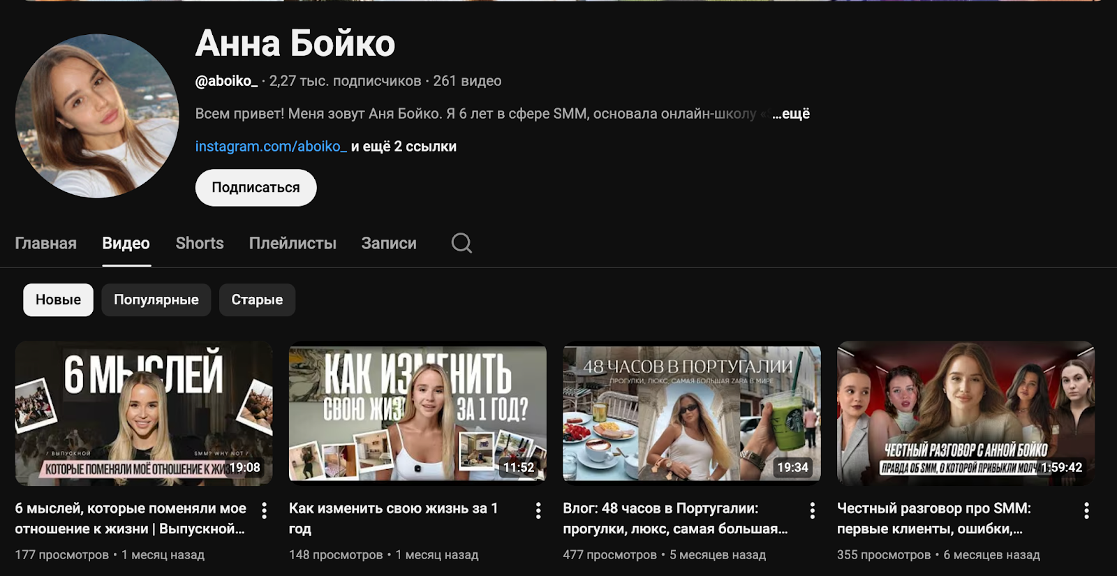 Youtube-канал Анны Бойко тоже сложно назвать популярным. Здесь она собрала 2,27 постоянных зрителей, для чего опубликовала более 260 роликов. Но они не так популярны, как хотелось бы специалисту по продвижению в соцсетях. Видео набирают лишь по несколько сотен просмотров. За все время существования проекта с 2017 года коуч получила только около 800 тыс. просмотров.