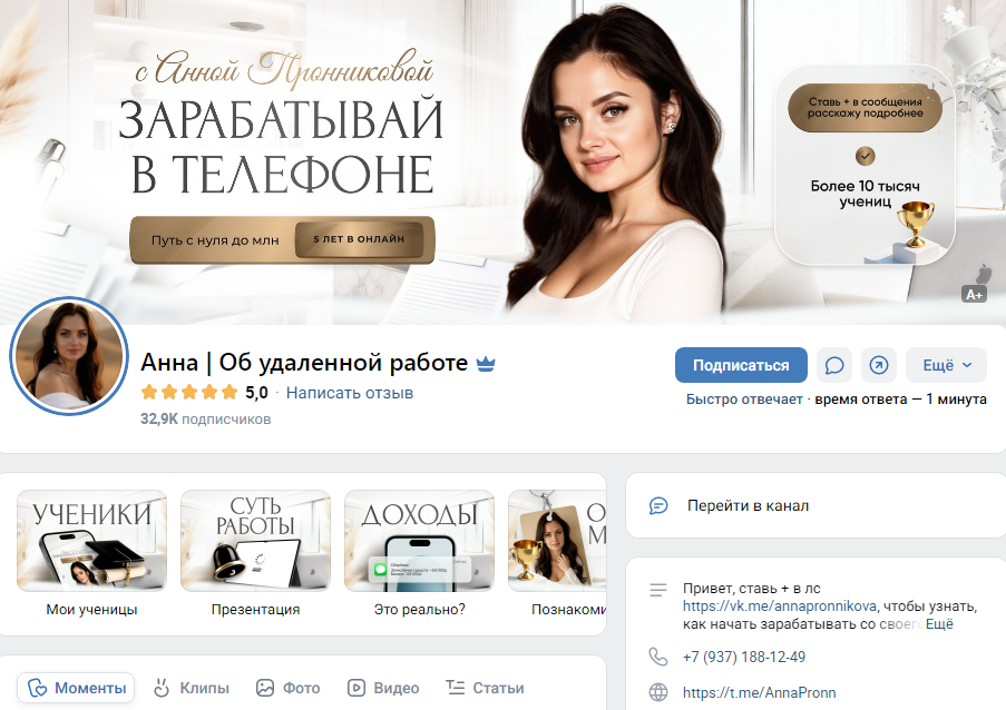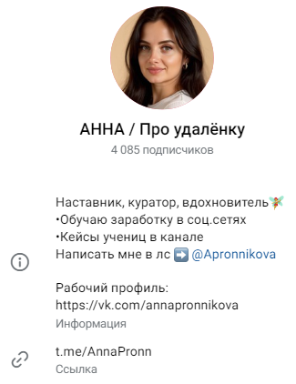 Успешная бизнесвумен Анна Пронникова предлагают пользователям работу на платформах ВК и ТГ. На сообщество наставника во ВКонтакте подписано 32 915 юзера.