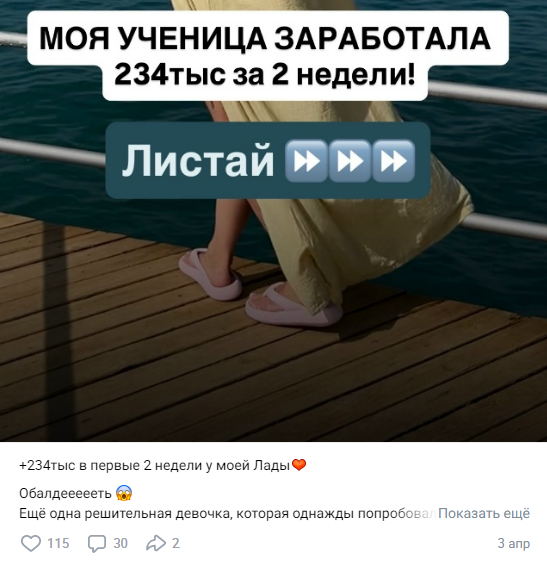 Но ее студенты также показывают внушительные результаты уже в процессе обучения: 234 000 рублей за половину месяца.