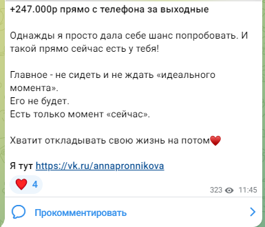 В Телеграме реакций и комментариев под постами Ани почти нет. Публикации просматривает только 5% аудитории. Во Вконтакте вовлеченность подписчиков находится на отметке 0,5%. То есть, интернет-персонаж Анна, ведущая блоги об удаленной работе, просто пытается создать образ прибыльного проекта, чтобы люди «клюнули» и купили ее услуги.