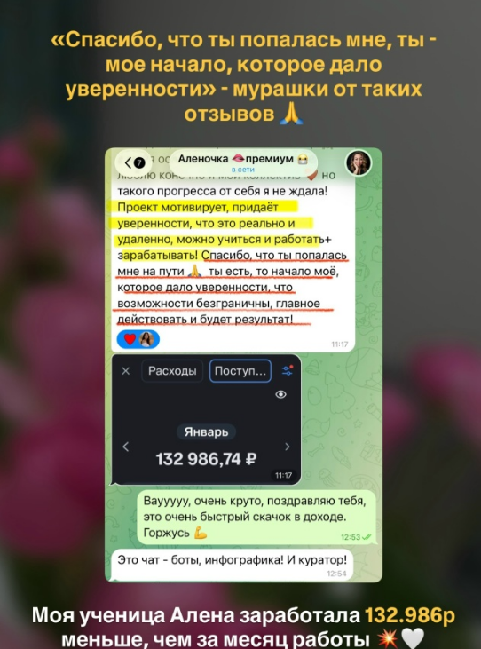 Повторить путь успеха профессионального куратора может каждый, согласно заявлениям администратора канала AnnaPronn. В ТГ организатор проекта Анна также выкладывает личные отчеты об удаленной работе и позитивные отзывы студенток.