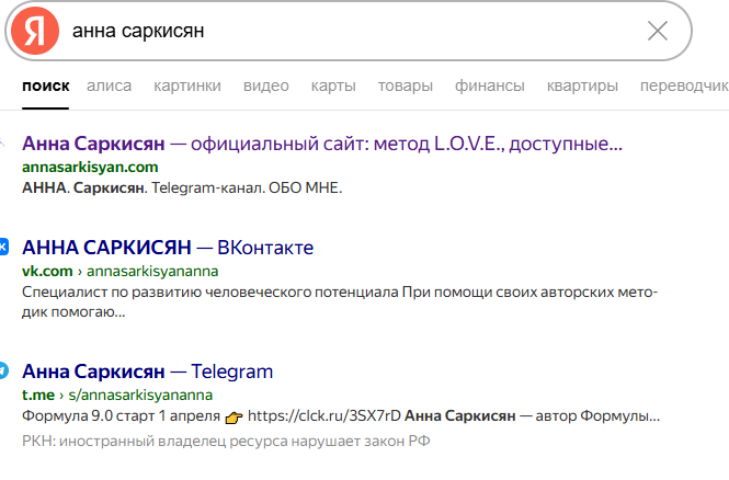 Поисковик «Яндекс» практически не проливает свет на личность человека по имени Саркисян Анна Рафаэловна. По соответствующему запросы мы видим в основном страницы, которые принадлежат ей самой. Это тревожный признак «дутого эксперта».