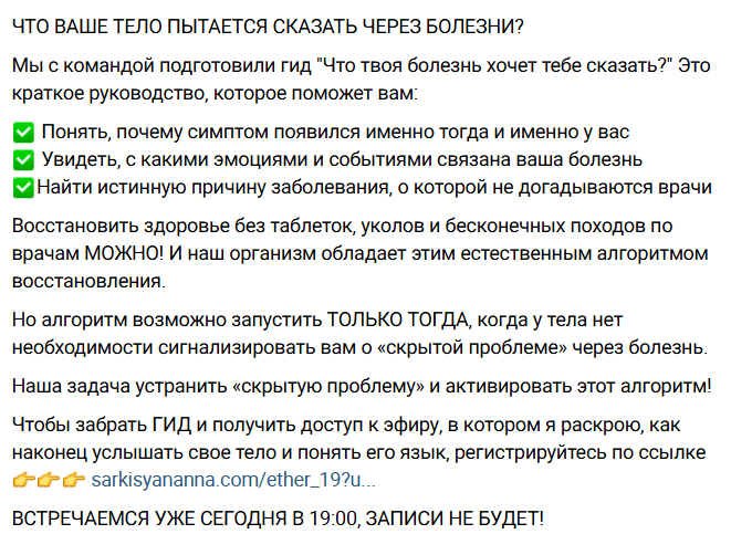 Помимо относительно «безобидного», хотя и бесполезного курса «Нелюбимая работа как симптом», Анна Саркисян ведет и откровенно опасные тренинги. Например, на одном из них она рассказывает, «что тело пытается сказать вам через болезни». Анна предлагает слушателям «восстановить здоровье без таблеток и врачей». Для людей с серьезными заболеваниями упущенное для обращения за квалифицированной медицинской помощью время — это гигантский риск.