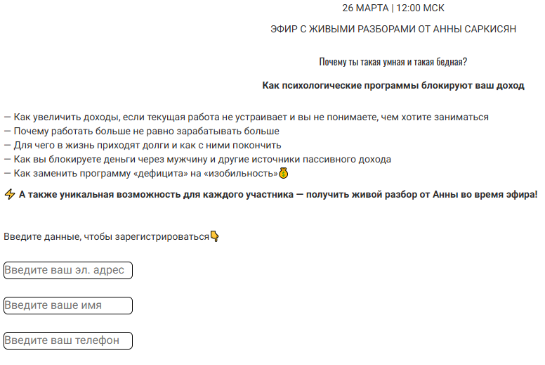 Каждый курс сопровождается описанием программы, но оно написано крайне неконкретно. Например, на тренинге «Почему ты такая умная и такая бедная» Анна обещает рассказать, почему в нашу жизнь приходят долги и как заменить «дефицит» на «изобилие» в своей голове. Фактически с такой программой скамерша может говорить что угодно, лить тонны воды — и все равно оставаться «в рамках плана».