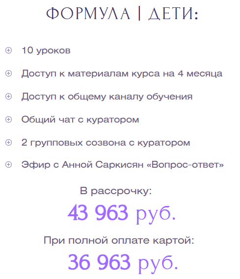 На официальной странице Саркисян Sarkisyananna любой желающий может приобрести ее курсы. Например, модуль «Дети» стоит 44 тыс. руб. Примечательно, что оплата через сайт невозможна. Чтобы ее выполнить, клиент должен связаться с менеджером. Это признак мошенников: они любят предоставлять пользователям одноразовые реквизиты, чтобы сделать невозможным возврат уплаченных средств.