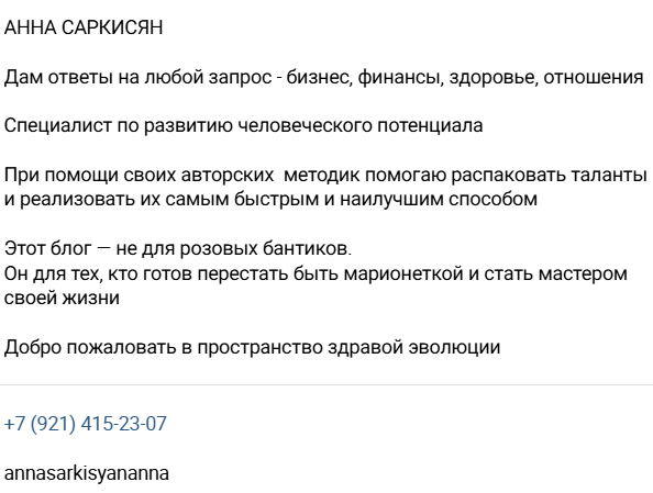 Саркисян обещает дать клиенту ответ на любой вопрос о финансах, бизнесе, здоровье и отношениях. Она якобы является экспертом во всех этих очень разных сферах, что выглядит весьма сомнительно. Скорее всего, девушка толком не разбирается вообще ни в чем из перечисленного.