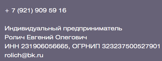 Для связи с техподдержкой предусмотрены номер телефона и адрес электронной почты, это удобные варианты для клиента. Анна ведет свою деятельность как ИП Евгений Ролич, то есть под чужим именем. Это подозрительно.
