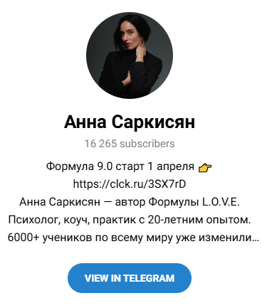 У Саркисян есть блог в Телеграм: Sarkisyan Anna. На него подписаны 16 тыс. человек, но читают посты менее 1 тыс. Реальная популярность Анны совсем невелика.