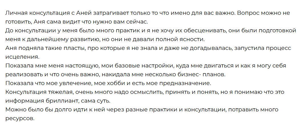 Одна из клиенток написала позитивный отзыв о курсах Анны Саркисян. Однако в реальности он характеризует мошенницу не с лучшей стороны. Она во время своей консультации якобы «подняла пласты и запустила процесс исцеления», «показала базовые настройки» и так далее. Мы не видим никакой конкретики в этих словах. Скорее всего, сеанс ограничился пустой болтовней и «мотивационными призывами», которые так любят аферисты.