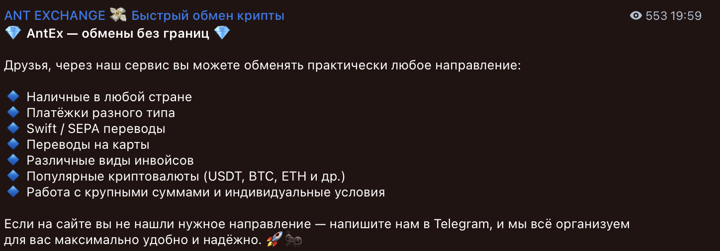 В правилах обмена также указано, что клиент обязан предоставить свой рабочий Telegram-контакт. Сама платформа также имеет собственный канал, в котором анонсирует изменения в работе сервиса и проводит розыгрыши призов. Клиентская поддержка доступна через телеграм antx support и электронную почту support ant exchange.