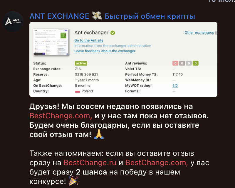 На канале Здесь проводится еженедельный конкурс на $50, участие в котором требует обязательного положительного отзыва на BestChange. Таким образом, тысячи хвалебных оценок, которые мы видим на мониторингах, являются плодами заказного маркетинга и попыткой скрыть истинное положение дел.