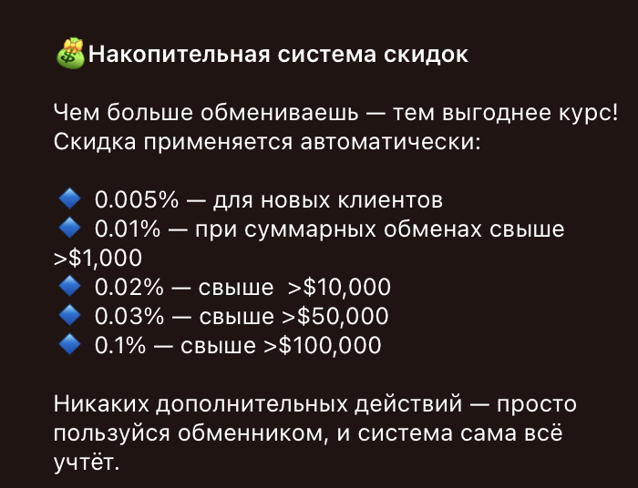 Наряду с этим работает накопительная система скидок. Здесь действует простой принцип: чем больше средств пользователь обменял через площадку, тем выгоднее становится его курс. Скидка применяется автоматически и имеет пять ступеней: она начинается с 0.005% для новых клиентов и достигает максимума в 0.1% для тех, кто совершил обмены на сумму свыше $100,000.