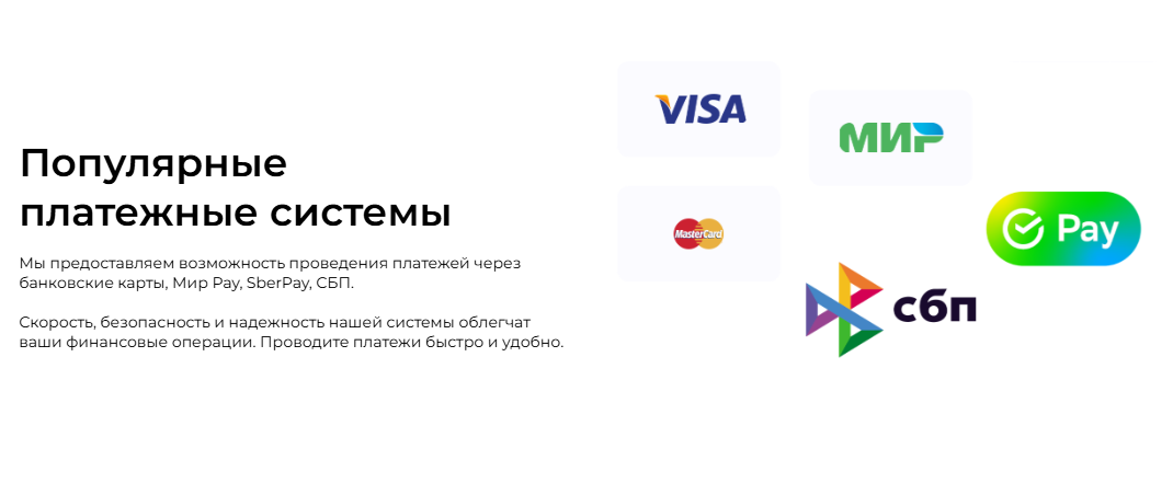 Что насчет тех самых провайдеров. то их на Antilopay Com не так уж и много. Судя по картинке на сайте, платежи принимаются только через Visa, MasterCard, МИР, SberPay и СБП. При этом, допустим, T-Pay в этом списке нет. Также отсутствуют какие-либо электронные кошельки и криптовалюты.