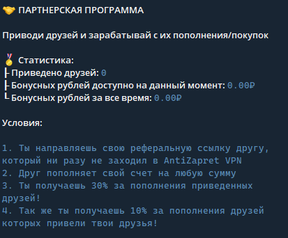 Реферальная ссылка генерируется в разделе партнерки в Телеграм «Антизапрет VPN». Отправляешь друзьям в мессенджеры или соцсети. Они пополняют баланс – ты получаешь 30% сразу. Друзья твоих друзей дают еще 10% сверху. Многоуровневая схема напоминает MLM.