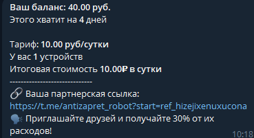 Сутки Тг «Антизапрет ВПН» стоят 10 рублей. Деньги списываются каждый день автоматически. Баланс положительный – VPN крутится. Закончились деньги – доступ приостанавливают. Никаких предупреждений о скором списании не приходит. Первая пятидневка идет в подарок. Новичкам дают 50 рублей на старте. Потом нужно пополнять самому через раздел в боте.