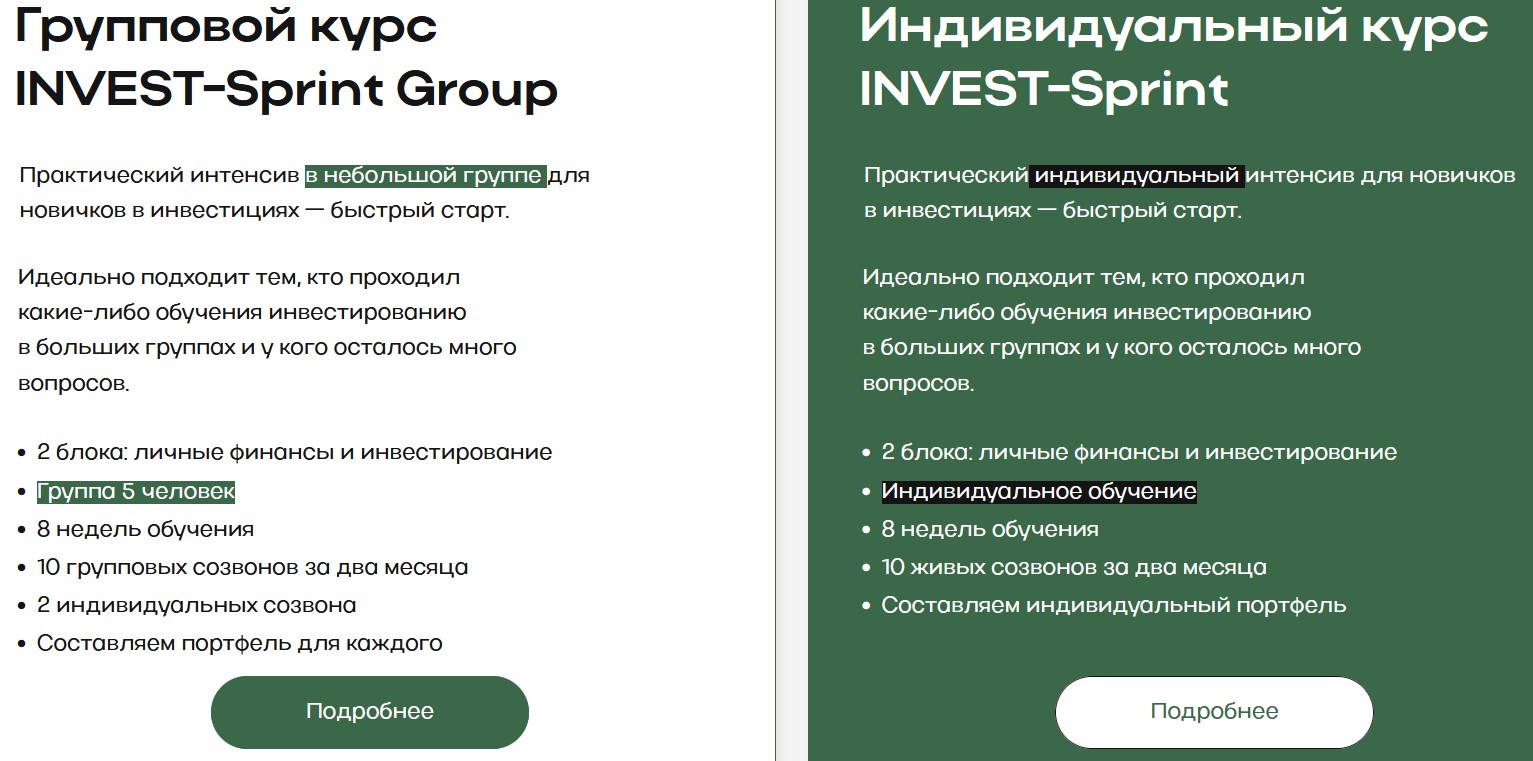 Курсы продаются по 15-20 тысяч рублей. Они рассчитаны на новичков, которые после их прохождения якобы начнут полностью понимать темы. Всего есть три курса: групповой инвест-спринт, индивидуальный и Bonds-спринт по облигациям.
