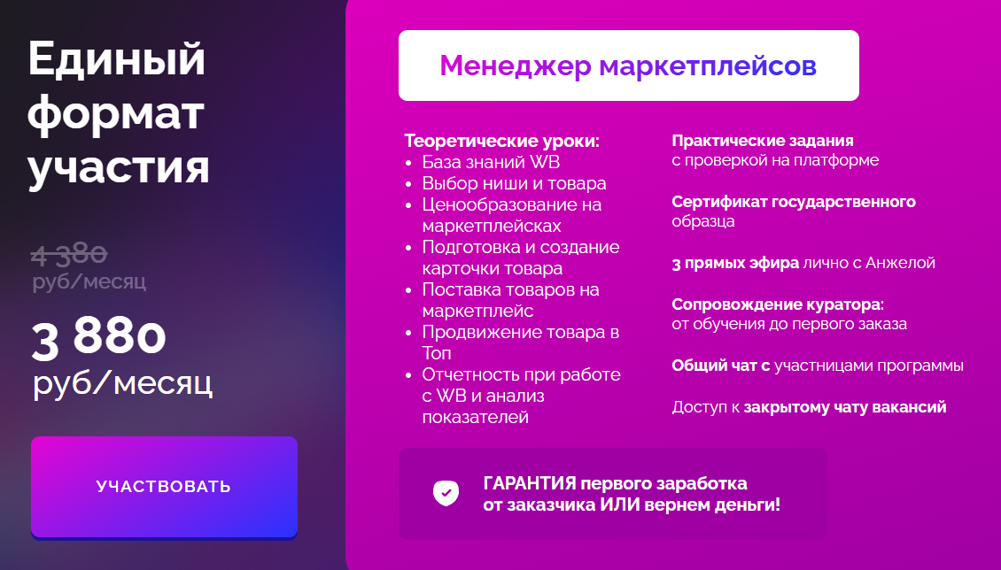Курс от школы «Онлиум» и Анжелы Шнайдерман «Менеджер маркетплейсов» длится шесть недель. Создатели обещают выход на доход от ₽100,000 в месяц и гарантию первого оплачиваемого заказа. Обучение проходит на платформе GetCourse, доступ к материалам сохраняется три месяца после окончания курса.