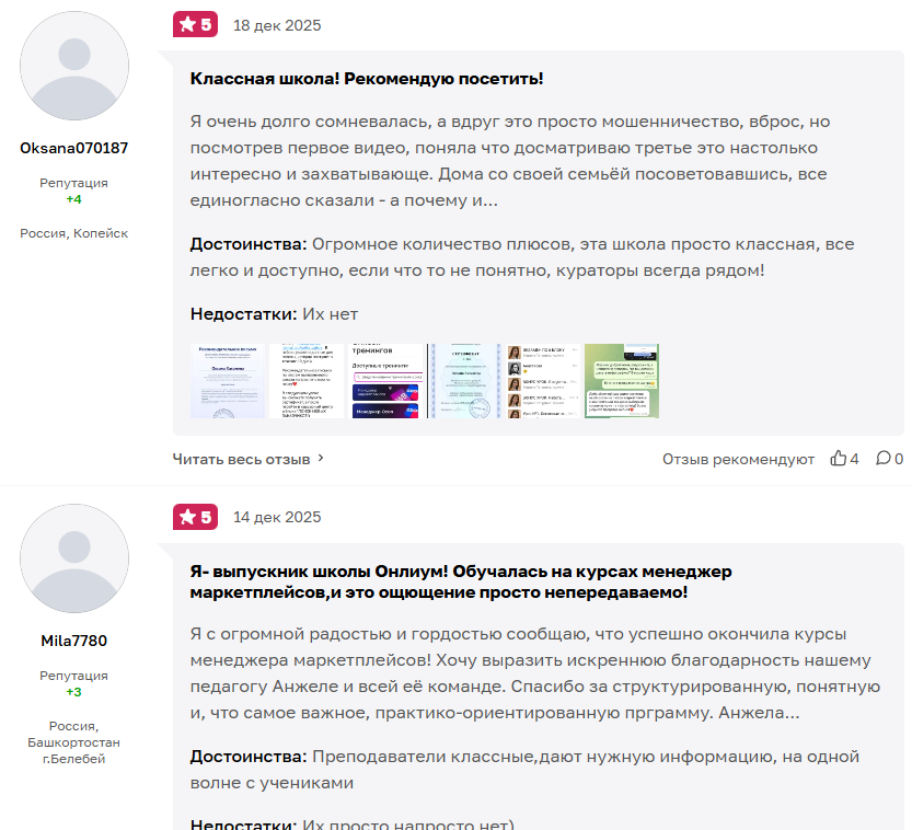 На платформе Otzovik 242 отзыва о школе и курсе Анжелы Шнайдерман со средней оценкой 4.9. Большинство положительных отзывов оставлены новыми аккаунтами без истории активности – это признак накрутки. Среди реальных независимых отзывов картина неоднородная.