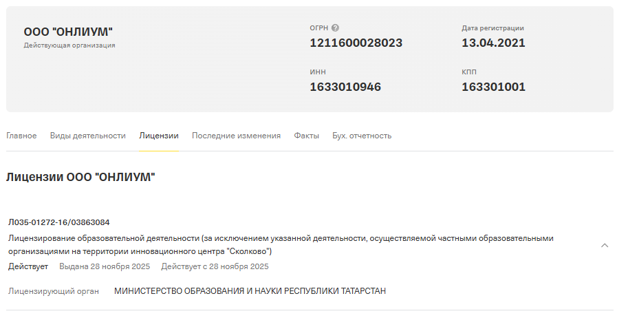 Автор курса – Анжела Шнайдерман. Юридическое лицо ООО «Онлиум» зарегистрировано в Казани в апреле 2021 года, основной вид деятельности по ОКВЭД – дополнительное образование.