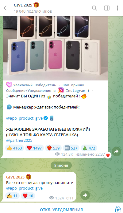 Аноним с ником в ТГ App Product Give создал канал Give 2025. Его автор представляется Тамаевым, но не раскрывает свою личность. По его словам, основной целью проекта является помощь людям. Полезного контента на канале нет. Есть только посты с фото iPhone и призывами писать админу, чтобы выиграть смартфон.