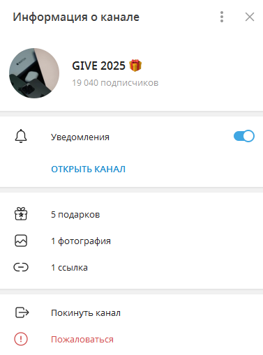 Канал был создан в 2022 году, но первый пост датируется декабрем 2024 года. Возможно предыдущий контент был удален. С тех пор никаких публикаций не было, а 8 июня 2025 год появился новый пост о том, чтобы обращаться к админу. У канала Give 2025 19 тысяч подписчиков. Последний пост просмотрело около тысячи человек. Оставлять комментарии автор возможность закрыл.