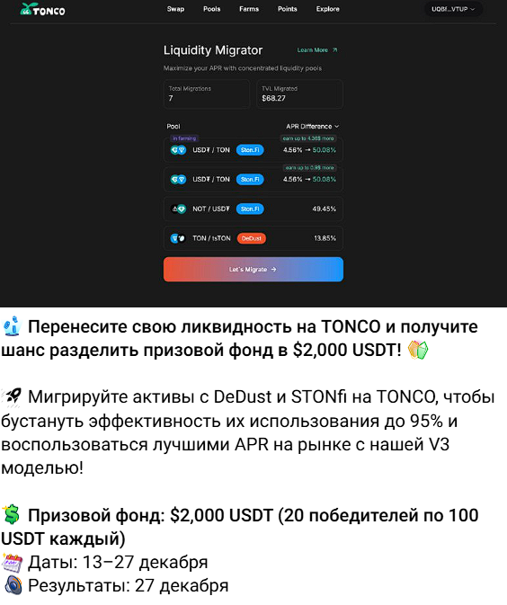 Платформа App Tonco io всерьез намерена побороться с другими ведущими DEX-биржами. Уже сейчас пользователям предлагают бонусы за то, что они перенесут свои активы с платформ Ston fi или DeDust. Несмотря на амбиции создателей проекта, пока Tonco io еще не может бороться с топовыми биржами. Объем суточной торговли на этой площадке заметно уступает лидерам рынка.