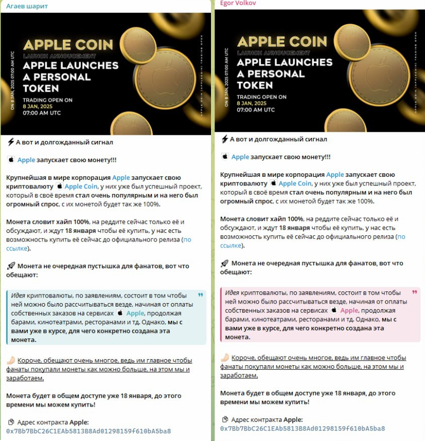 Еще один подобный криптоинвестор Идрис حوت | Теневой Шейх продвигал эту же монету в ноябре 2024 года. Текст был примерно тот же, но дата запуска отличалась. Как правило, монеты вроде Эппл Коин рекламируют в течение недели на сомнительных Телеграм-канах, а после – переходят к продвижению следующего хонипота. Примечательно, что монета Apple token продавалась только с нескольких кошельков. Другим пользователям было запрещено проводить ее продажу. Иными словами, создатели просто искусственно пампили ее курс, продавали обманутым пользователям, а после она просто превращалась в кирпич.