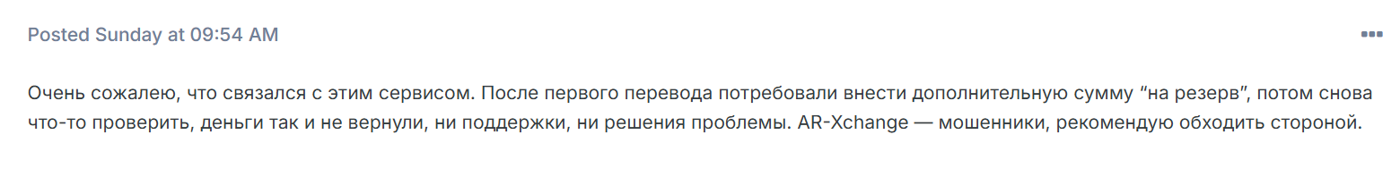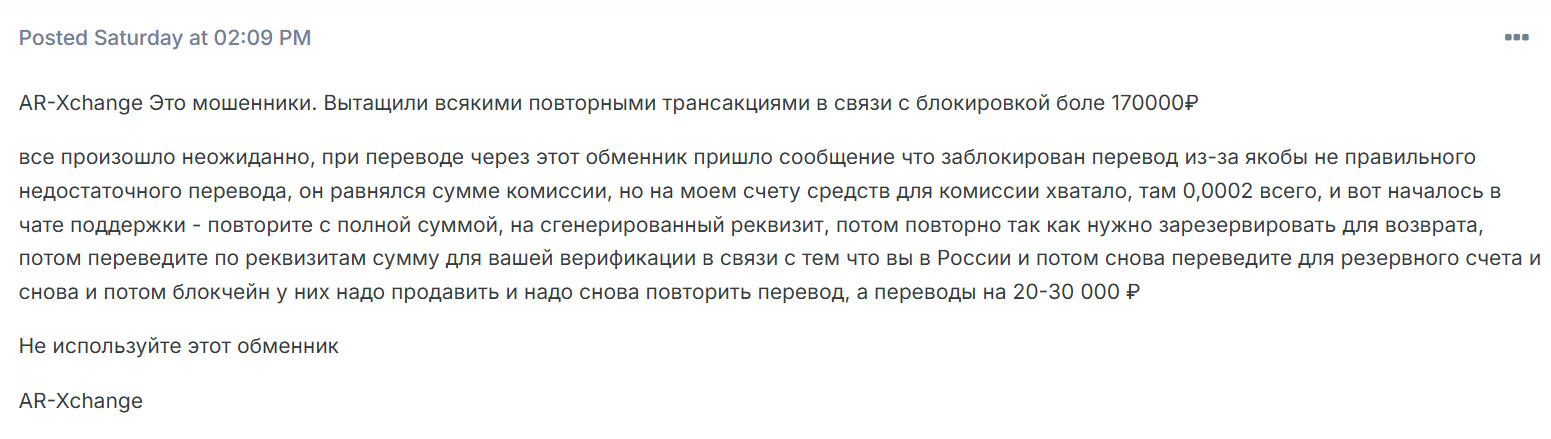 О криптовалютном обменнике Ar xchange com отзывы на внешних ресурсах встречаются исключительно негативные. Их не много, так как сервис проработал около месяца. Люди утверждают, что сталкиваются с классической для скам-сервисов проблемой. Перевод зависает или блокируется и его нужно повторить. Если клиент повторяет, то нужно будет заплатить за верификацию. Далее потребуется провести оплату на резервный счет и т.д. Такие ресурсы продвигаются арбитражниками, когда встраиваются в схему связок в качестве одного из элементов. В итоге только Arxchange ex отзывы получает о мошенничестве, а тот, кто предоставил связку, якобы не имеет к этому отношения.