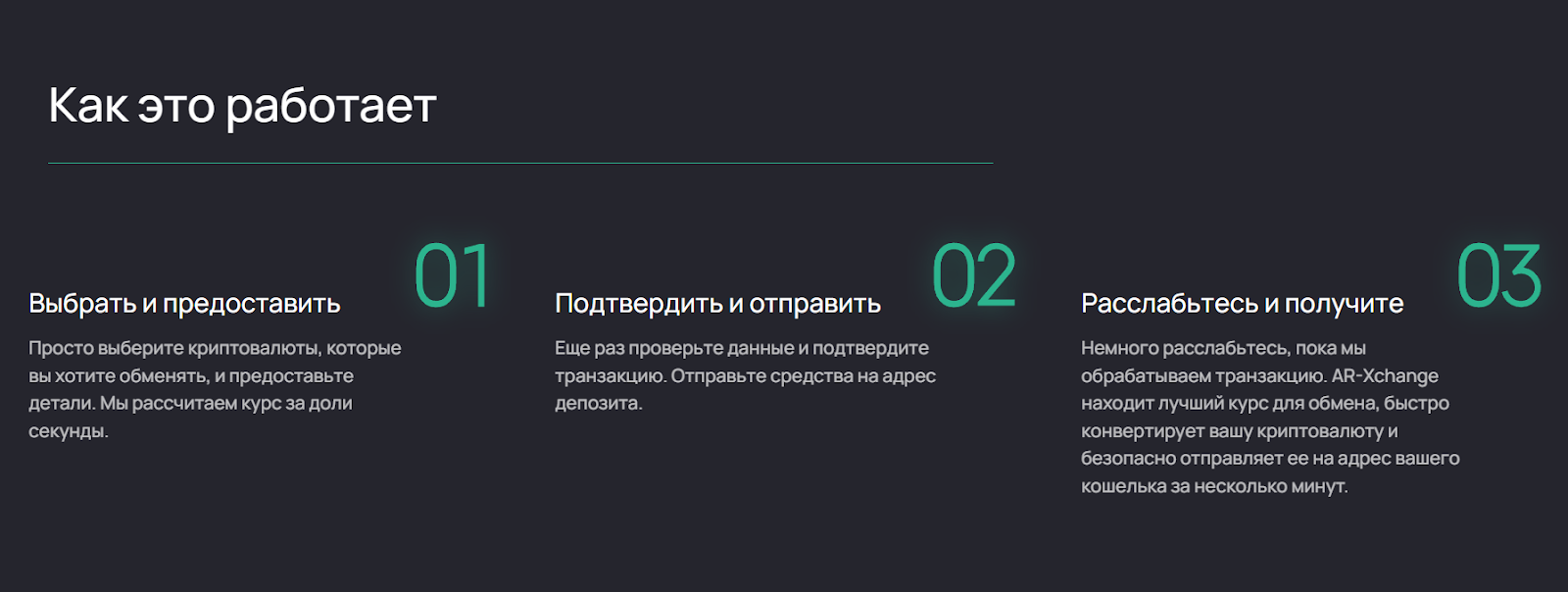 Мы проанализировали работу сайта по обмену криптовалют Ar xchange com, рассмотрели условия, дополнительные предложения, описания и оценили репутацию сервиса. Теперь можем отметить такие особенности: