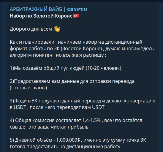 Признаков того, что у подписчиков канала забирали деньги, не было. Деньги ни за какие услуги не просили, но все равно в ленте присутствуют сомнительные предложения. Например, клиентам предлагали отправлять деньги по Золотой Короне неизвестным людям, а затем получать отправленную сумму обратно уже в USDT и с процентом прибыли.