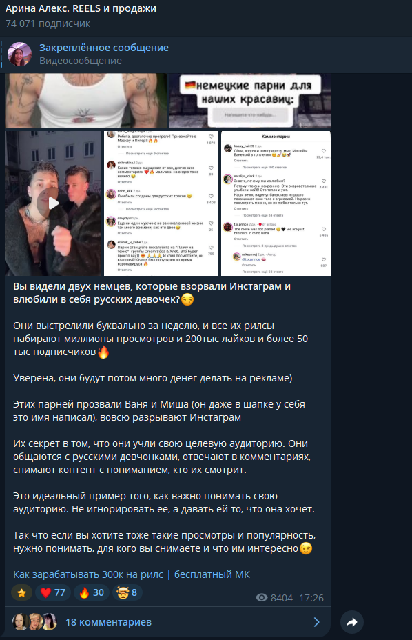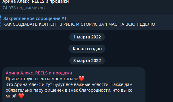 О телеграм канале Арины Алекс можно сказать то же самое. Да, в сообщество вступили 74+ тыс. человек, но посты посещают лишь примерно 8 тысяч из них. Такая относительно низкая активность может говорить даже о накрутке.