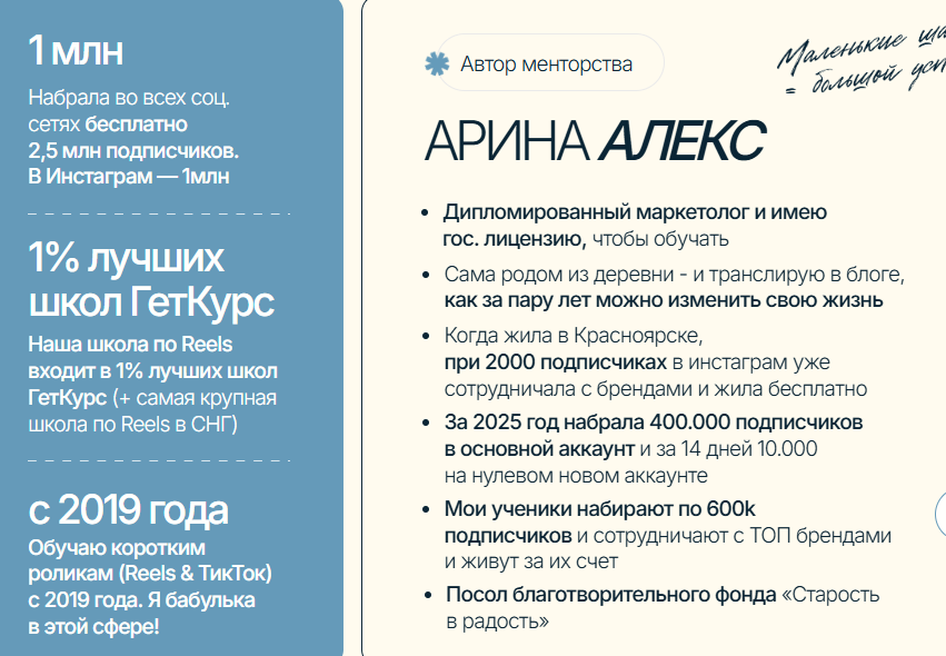 Арина Алекс – это блогер с миллионной аудиторией в социальных сетях. Добившись успеха на ряде площадок, девушка запустила курсы, на которых рассказывает, как повторить ее успех. Ментор утверждает, что ее ученики сотрудничают с популярными брендами и почти не уступают ей в популярности. Наша задача – проверить, действительно ли благодаря коучу можно приблизиться к уровню топовых инфлюенсеров или же нет.
