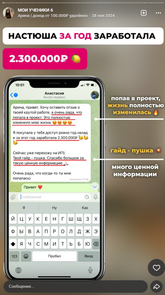 В группах Арины Ралиной про фриланс можно найти отзывы клиентов, которые начали зарабатывать сотни тысяч рублей или даже миллионы, которые представлены в виде скринов переписок и выплат – их легко можно подделать.