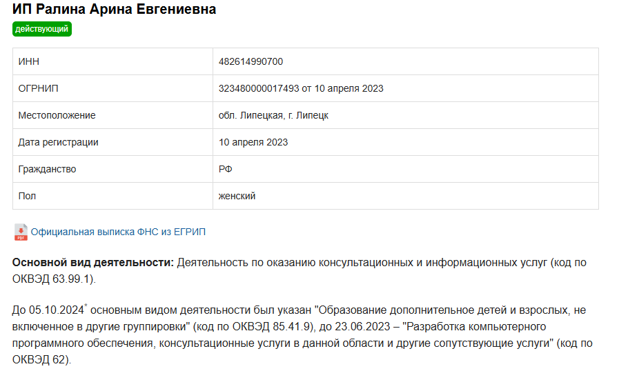 Обслуживанием платежей и разработкой платформы для оказания услуг занимается ООО «Продамус», но эта организация не является продавцом. Юридическая информация говорит лишь о том, что Арина действительно является предпринимателем, но не подтверждает ее компетентность или заработок.