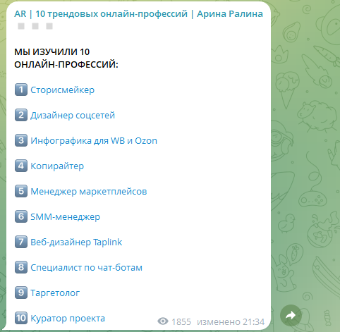 По словам Арины, ее клиенты получат доход от ₽100,000 удалённо, пройдя ее курсы – предприниматель помогает определиться с направлением и сделать свои первые шаги. Речь о 10 профессиях, например, о сторисмейкере, дизайнере и других, которые могут быть актуальны в 2025 году.