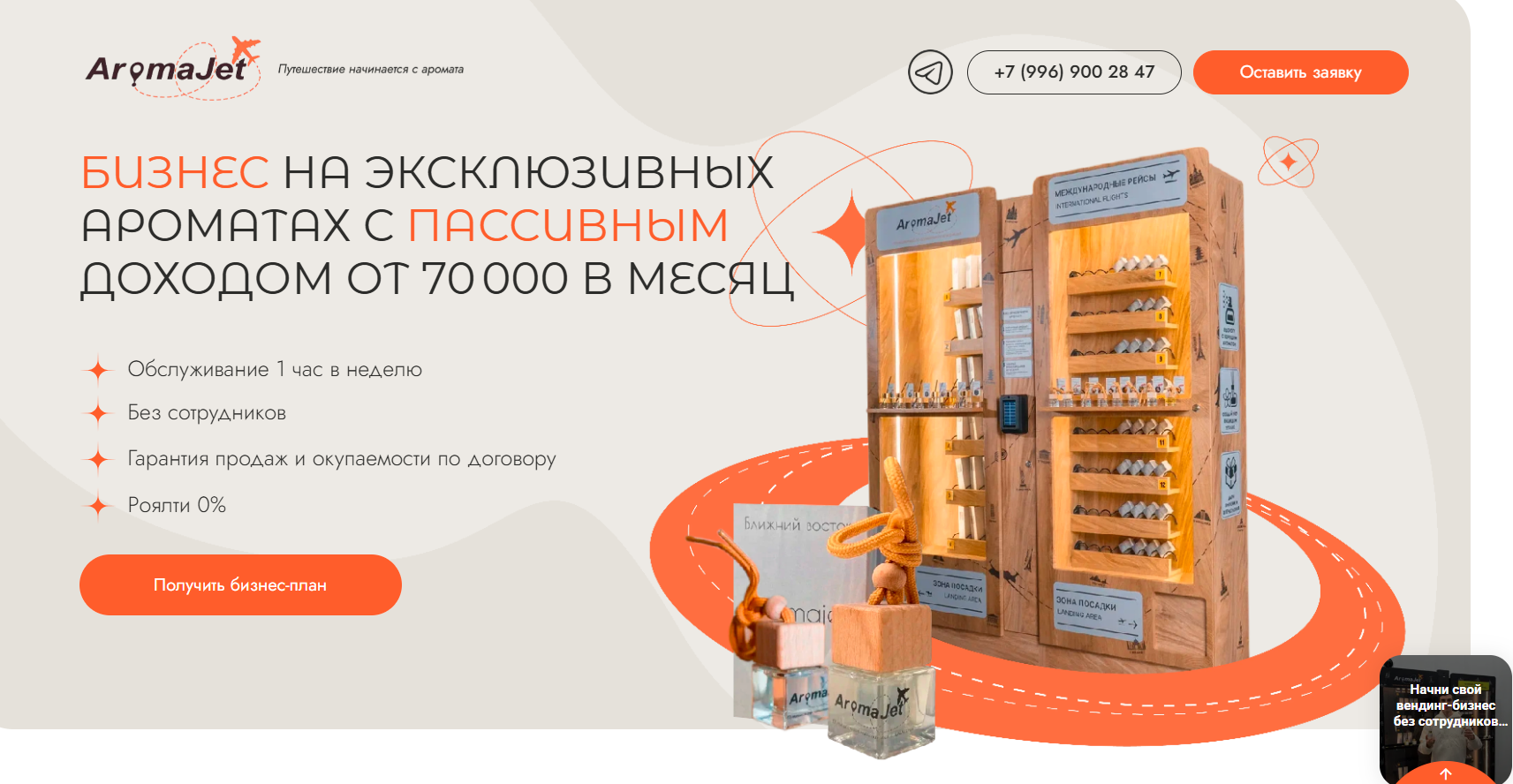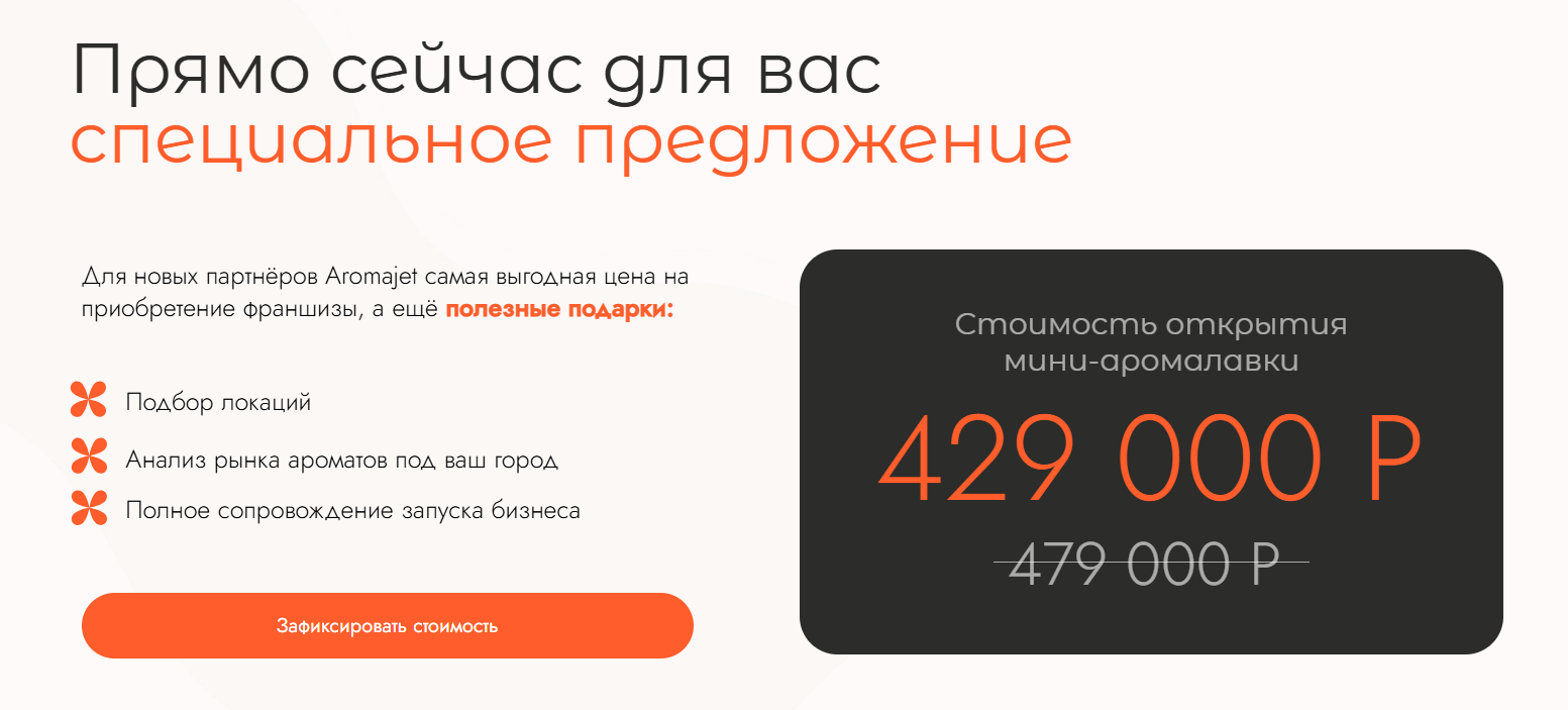 Цена входа – ₽429,000, а годовая прибыль по франшизе «АромаЖет» доходит до ₽1,000,000. Все данные ничем не подкреплены. Ни юридических условий, ни четких гарантий, ни финансовых расчетов на сайте нет.