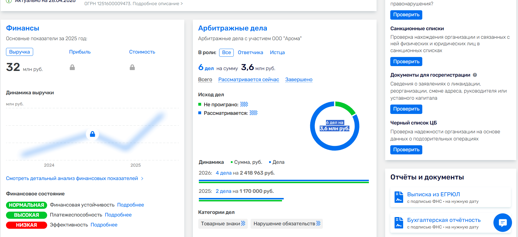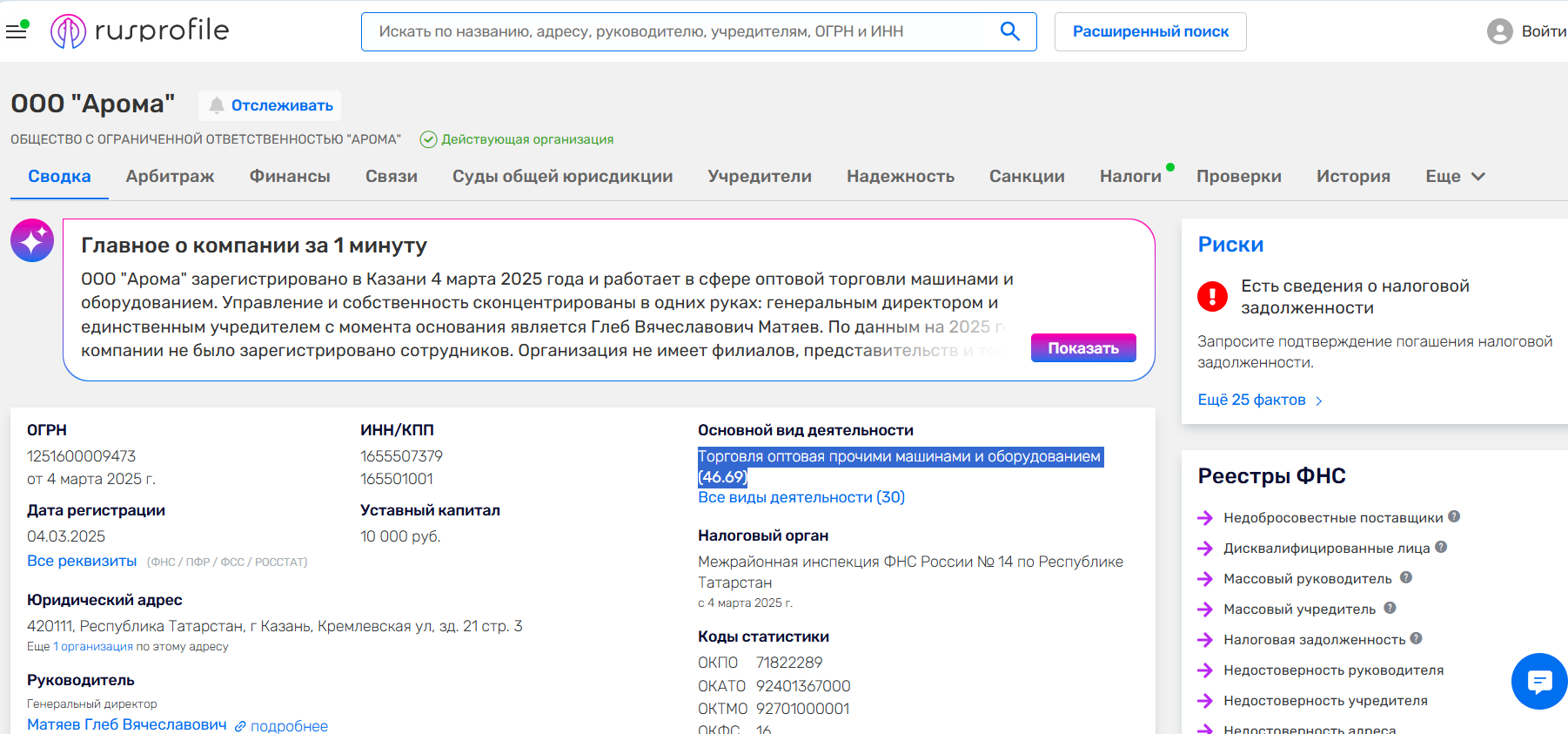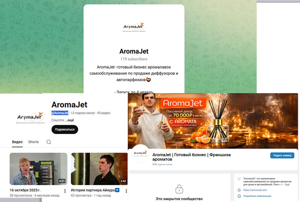 В «подвале» сайта написано, что клиенты компании «АромаДжет», на франшизе которой построен доход ее владельцев, получают услуги от ООО «Арома». По данным RusProfile фирму основали в марте 2025 года и ее основная деятельность – оптовая торговля машинами и оборудованием.
