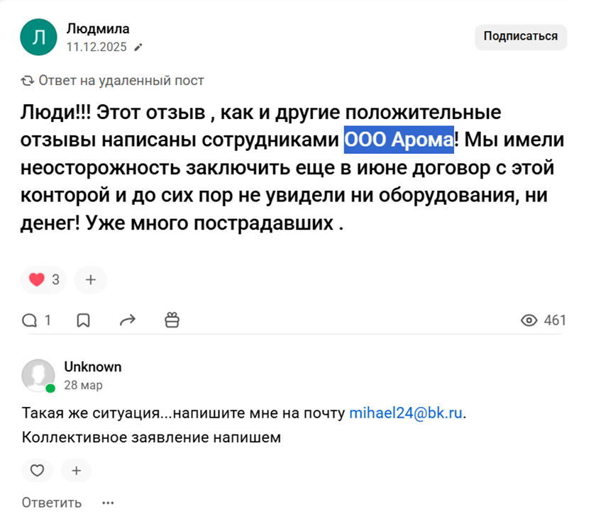 Есть негативные отклики, в которых клиенты говорят, что заключили договор с ООО «Арома», но не получили ни аппаратов, ни денег. Пользователи готовят коллективный иск в суд.