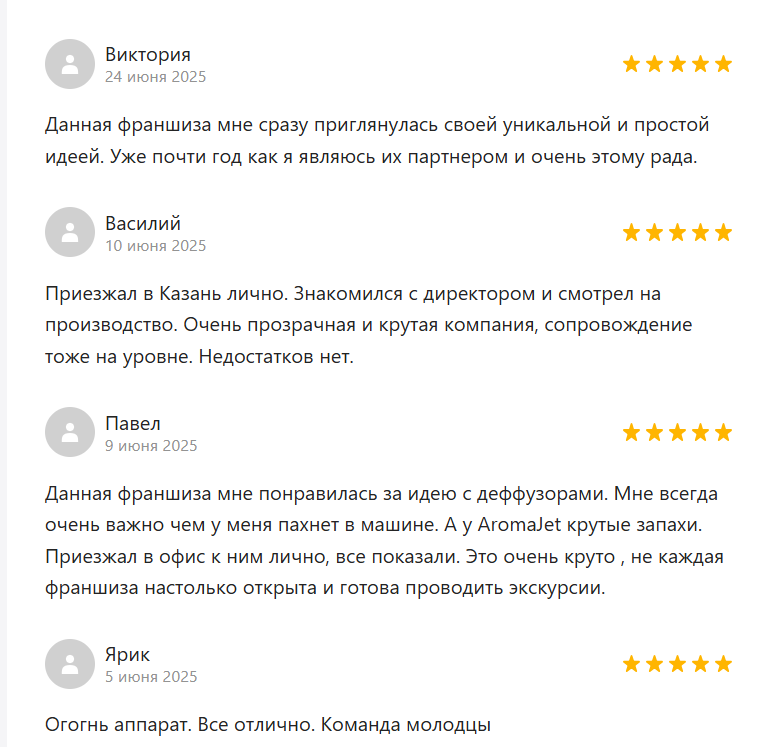 На дружественных сайтах, которые рекламируют сервис, отзывы об «AromaJet | Франшиза ароматов» положительные. Люди пишут, что условия сотрудничества выгодные, компания прозрачная, аппарат функциональный, а запахи сногсшибательные. Деталей работы по франшизе, расчетов, окупаемости и деталей нет.